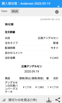 ちなみに領収書メールには配達した配達員の名前も載っていました。