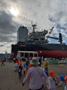 鐘が鳴らされ、進水準備が進み、「進水開始」。