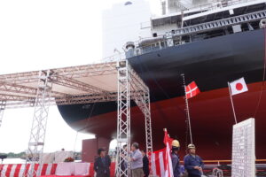鐘が鳴らされ、進水準備が進み、「進水開始」。