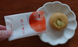 広島県産のりんごが白餡の中に入っています。上にのっているのもりんごかな。